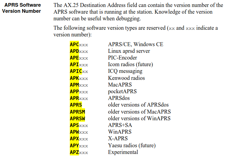 Well thats interesting… None of these destinations are real callsigns. Instead, they are “APRS Software Version Numbers”. The original APRS specification defines these as follows (more have been added over time):
