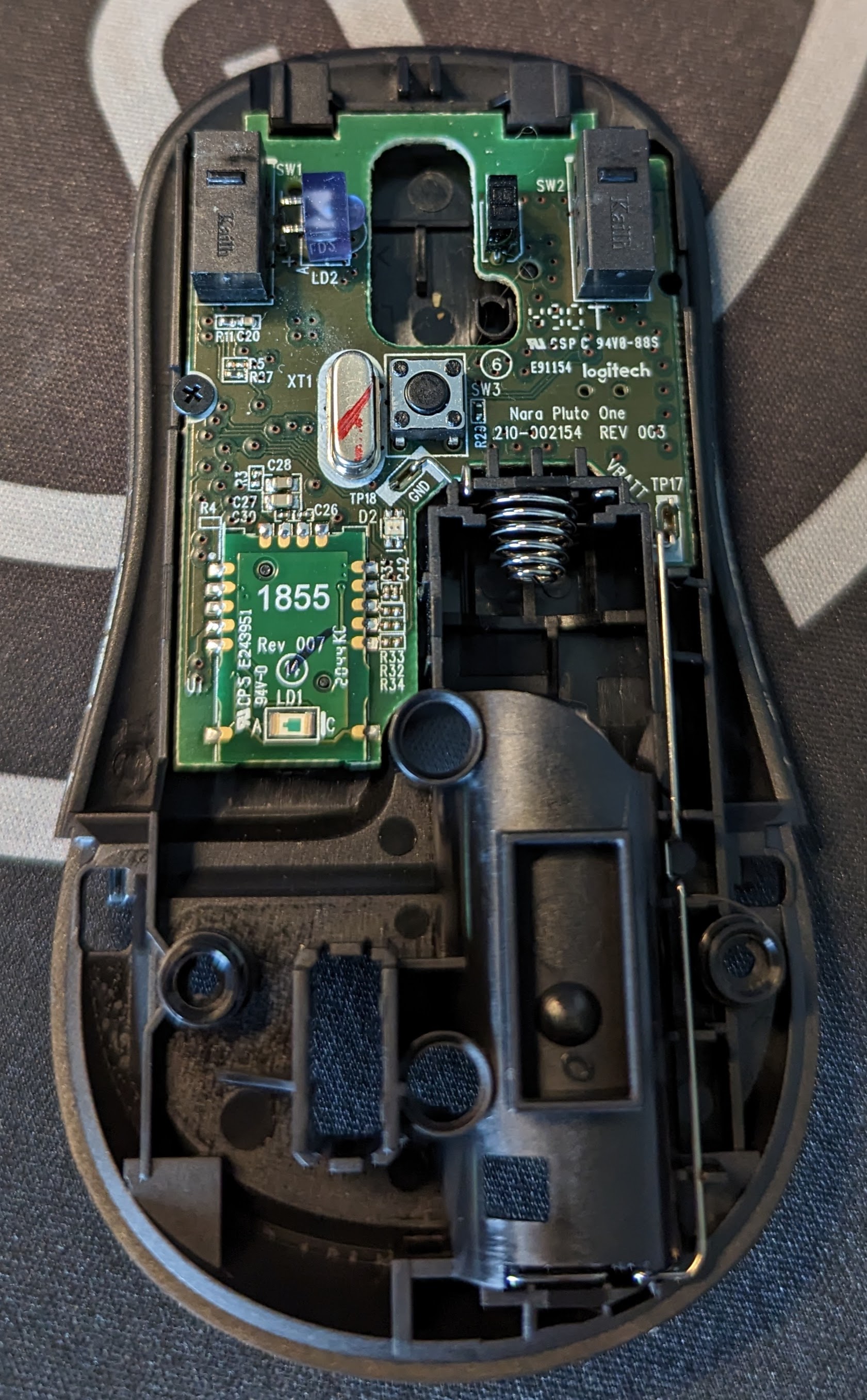 Disassembling the mouse was nice and easy. Simply pop off the battery cover, remove the battery, and unscrew two screws. The top just pops off, revealing one of the simplest circuit boards I’ve seen in a while.