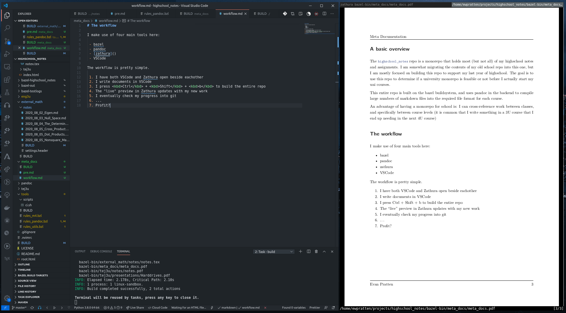 In terms of workflow, I write all my notes as markdown files with embedded LaTeX for any equations and charts I may need. All of this is done inside of VSCode, and I have a custom tasks.json file that lets me press Ctrl + Shift + b to re-compile whatever I am currently working on. I also keep Zathura open in a window to the side for a nearly-live preview system.